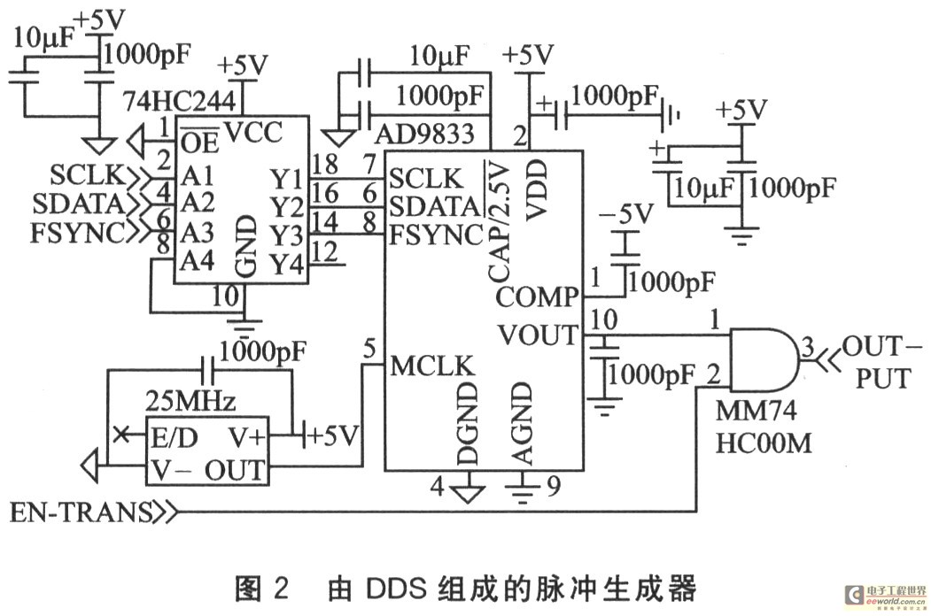 超聲波發(fā)射單元的脈沖生成電路如圖2所示。DDS的時(shí)鐘來(lái)源于25 MHz有源晶振。AD9833的SPI總線CLK、DATA、CS與微處理器的I/O口通過一片74HC244相連接。74HC244是八同相三態(tài)緩沖器,用于增強(qiáng)信號(hào)帶負(fù)載能力。通過微處理的控制,AD9833在VOUT引腳輸出需要頻率的方波。AD9833的輸出與微控制器的選通信號(hào)EN在與非門的作用下,在與非門的輸出端產(chǎn)生脈沖串,這個(gè)脈沖串經(jīng)過功率放大電路就可以對(duì)超聲波換能器進(jìn)行驅(qū)動(dòng)。