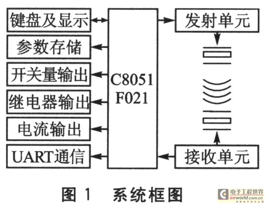 如圖1所示,整個(gè)系統(tǒng)以超聲波發(fā)射和接收電路為核心,采用直接數(shù)字頻率合成芯片AD9833產(chǎn)生脈沖串,經(jīng)過功率放大電路驅(qū)動(dòng)超聲波換能器,超聲波經(jīng)過懸濁液到達(dá)接收換能器,利用92 dB對(duì)數(shù)放大器AD8307對(duì)回波衰減信號(hào)進(jìn)行對(duì)數(shù)放大,最后由微控制器對(duì)數(shù)據(jù)進(jìn)行處理得出濃度值。系統(tǒng)還包括鍵盤、顯示、參數(shù)存儲(chǔ)、開關(guān)量輸出、繼電器輸出、電流輸出、UART通信等部分。