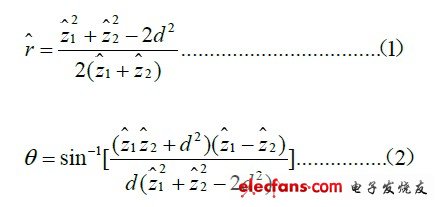 單片機可以計算出發(fā)射與接收到超聲波之間的時間,根據(jù)測溫系統(tǒng)的實際測溫, 查找出在該對應溫度下的聲速,計算出反射物距離兩接收端的距離。 理論上由以上兩個數(shù)據(jù)上就可以直接數(shù)學推導出該物體的空間位置(如圖2 和公式一、二所示)。