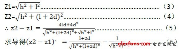 其中d 為R1 與R2 的距離,z1、z2 分別為物體到各個接收端的距離 ,如果直接這樣計算就會過于復雜,普通單片機處理的話耗時較多, 于是我們提出了一種基于計算二者距離差來大致判斷物體位置的方法。一般來講小車只關心在車前方的物體,我們設定一個距離參數(shù)l代表前方障礙物與小車的水平距離,再設定一個距離參數(shù)h,代表前方障礙物與小車的垂直距離。我們可以由下面的關系推導出h, l, d與z2-z1的關系(公式3---公式6)。